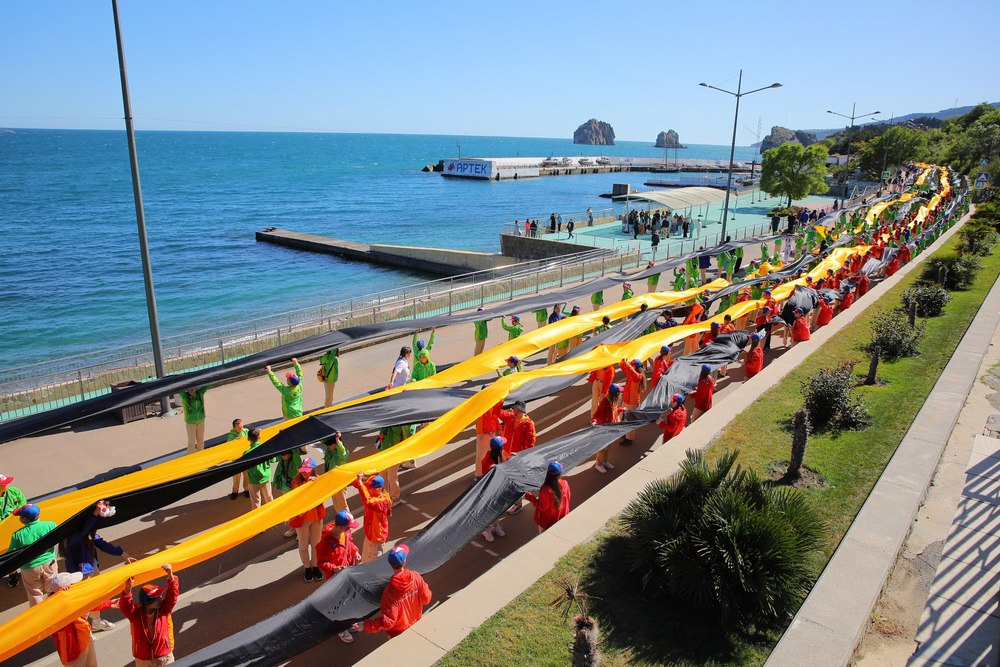 "В преддверии Дня Победы дети узнали историю символа и прониклись особым артековским духом праздника. Под песни, посвященные Великой Победе, артековцы развернули желто-черные ленты от детского лагеря "Лазурный" до детского лагеря "Морской", - рассказали в пресс-службе.