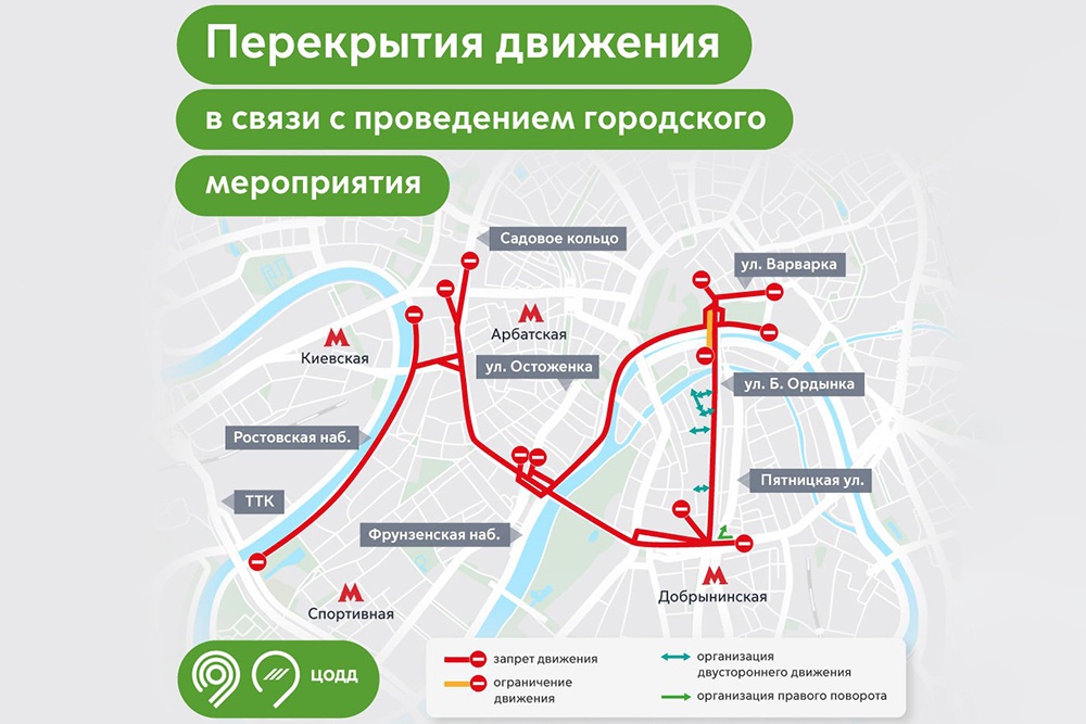 Для подготовки к мероприятию еще с 00:01 17 мая закроют для проезда площадь Васильевского Спуска от Кремлевской набережной до Большого Москворецкого моста. А с 20:00 18 мая - на Москворецкой улице от Москворецкой набережной до улицы Варварка. Откроют движение на этих участок только в 06:00 в понедельник, 20 мая.