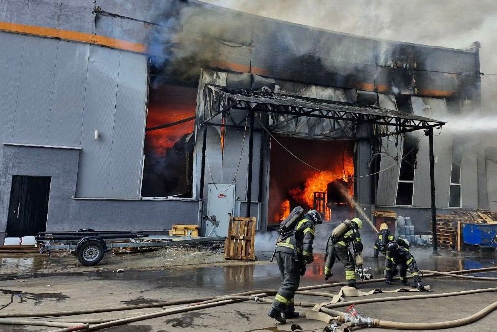 Пожар охватил площадь в тысячу квадратных метров. По данным спасателей, в здании находятся станки, печатная и лакокрасочная продукция.