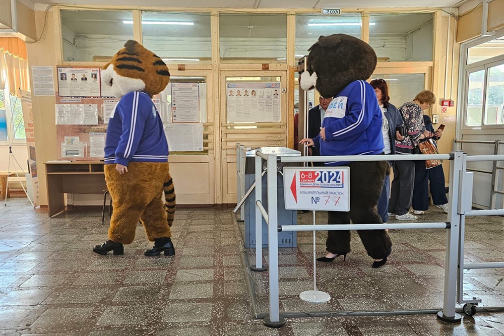 Два человека в костюмах маскотов - тигра и медведя - пришли избирательный участок №77. Он находится в Индустриальном районе в школе №24.