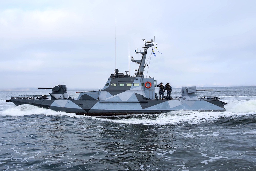 Фотография с катером типа Island, на который нанесены зубчатые узоры разных оттенков серого, сделаны на встрече украинских моряков с делегацией из Дании.
