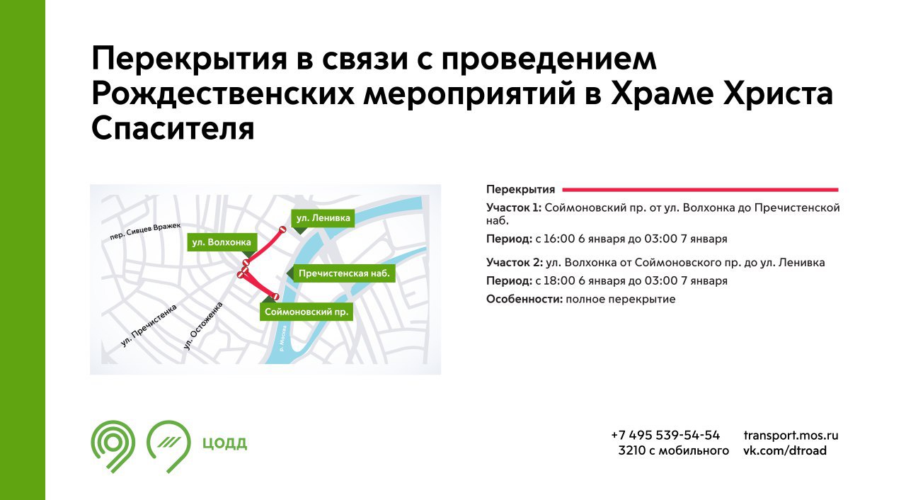 Так, движение закроют с 16:00 6 января до 3:00 7 января в Соймоновском проезде от улицы Волхонка до Пречистенской набережной. А с 18:00 6 января до 3:00 7 января на улице Волхонка от Соймоновского проезда до улицы Ленивка.