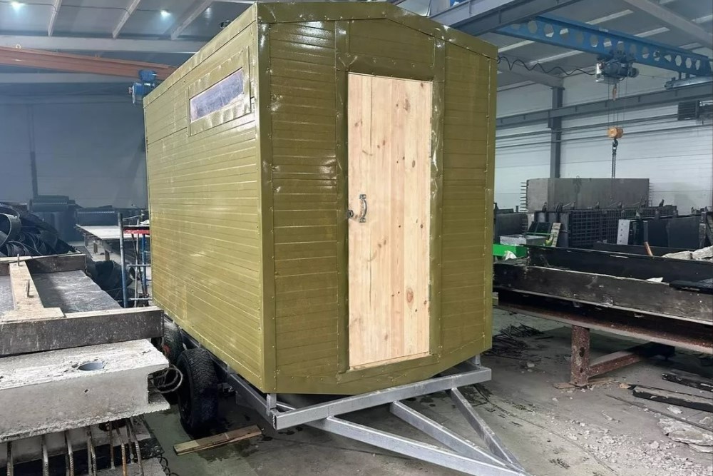 Местное предприятие каждый месяц выпускает мобильную баню. Она устанавливается на колесный прицеп, который легко буксировать любым транспортом. Изготовлена баня из сэндвич-панелей с облицовкой из нержавеющей стали.