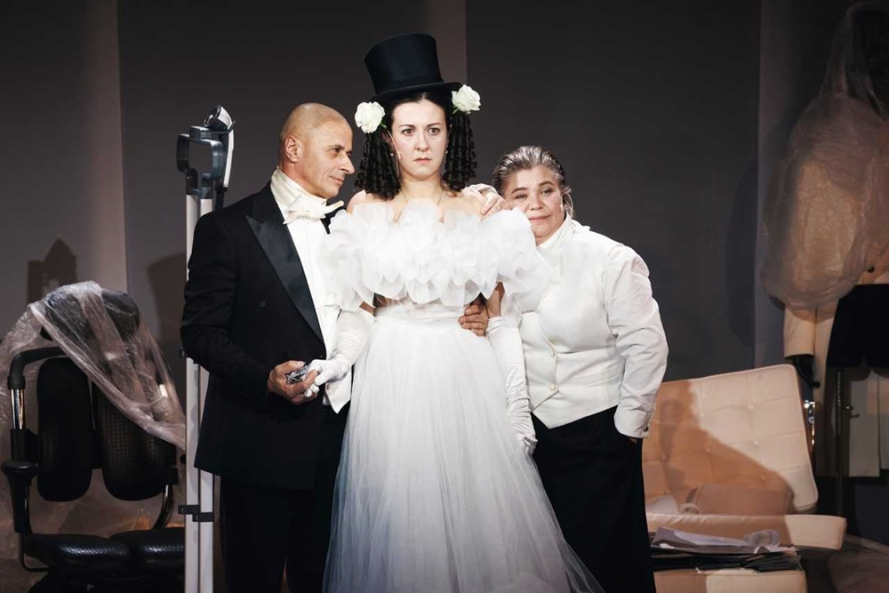 На сцене всего три актера. Хотя мы помним, что у Гоголя только мужских ролей несколько - Подколесин, его слуга, четыре жениха. Да еще невеста, ее тетка, сваха… Агафья Тихоновна Купердягина в первоисточнике - невеста 26 лет, героине спектакля Гафе - 36, она "в поиске серьезных отношений". У Гоголя - четыре жениха (и сначала он хотел назвать пьесу "Женихи"), здесь - пять.