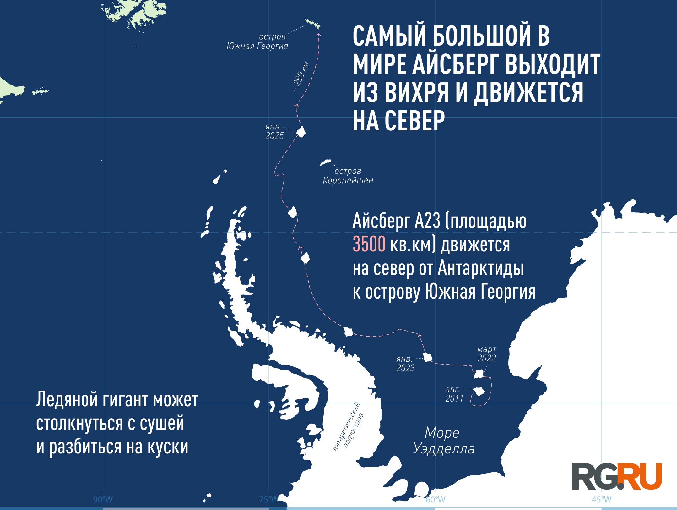 В зависимости от направления течений айсберг может пройти мимо острова, а может с ним столкнуться. Сейчас до Южной Георгии ему остается примерно 350 километров.
