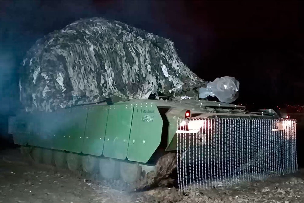 САУ получила дополнительное бронирование бортовых проекций, верхней передней части корпуса. Также цепями защитили от дронов-камикадзе нижнюю лобовую деталь. Появились дополнительные фары. На башне смонтированы сетчатые экраны. Все выполнено очень качественно.