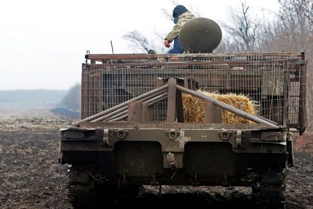 Также из-за нехватки техники эти гусеничные машины часто используются для перевозки боевиков, которые открыто сидят в кузове. Для этого там приварили подобия поручней. Чтобы как-то защититься от FPV-дронов, также установили решетчатые экраны.