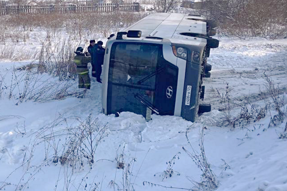 В понедельник утром на 191-м километре дороги между Шарыпово и Балахтой рейсовый автобус Hyundai, следовавший из Кызыла в Красноярск, съехал с дороги и опрокинулся в правый кювет, сообщили в региональном главке МВД.