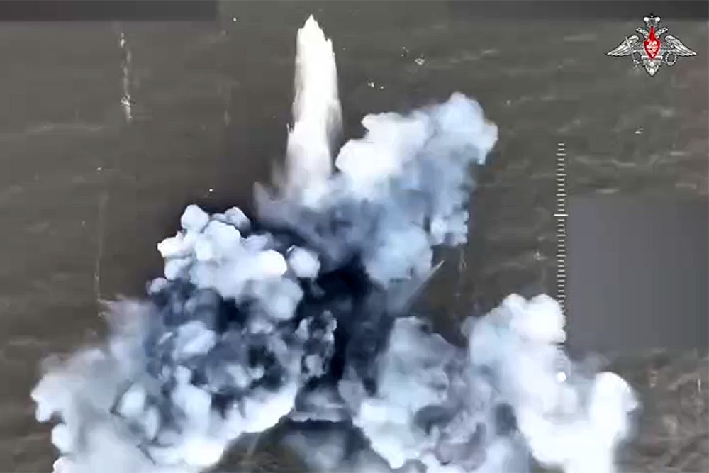 На видео можно увидеть лежащие на дне катера коробки и мешки со взрывчатым веществом. После удара российского БПЛА на месте взрыва поднимается столб густого дыма.