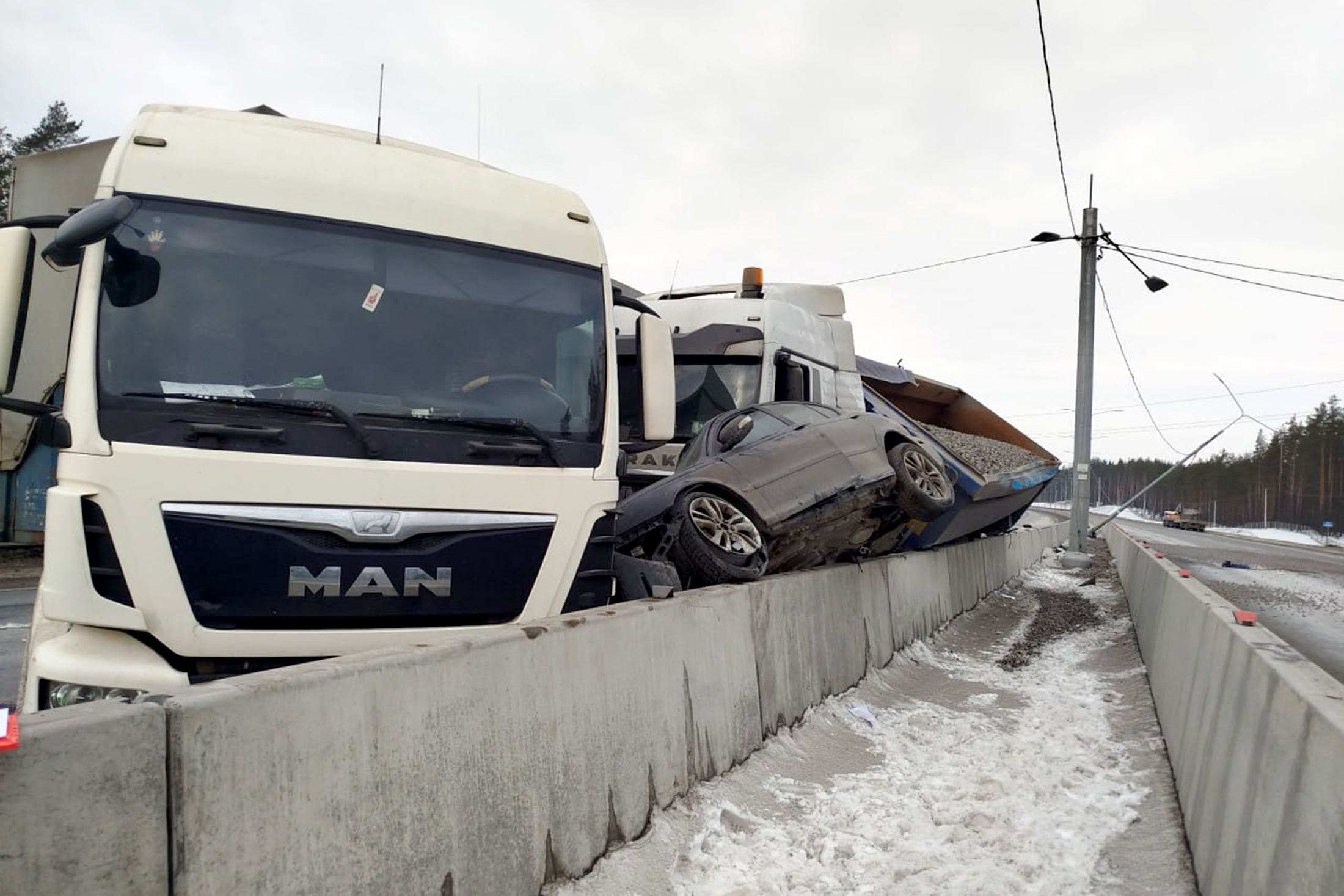 Как сообщают очевидцы в соцсетях, инцидент произошел на федеральной трассе "Скандинавия" в Выборгском районе. Одну из фур развернуло поперек дороги, в нее врезался еще один грузовик и легковушка. В итоге большегрузы смяли иномарку и подняли ее на бетонное ограждение.
