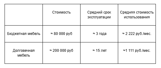 Здесь нужно поподробнее и даже на цифрах, потому что это действительно так, один и тот же шкаф может стоить и 80, и 180 тысяч. Только в первом случае можно не рассчитывать, что это будет мебель "на века", а во втором случае, есть все шансы стать владельцем не только красивой, но и качественной мебели. Более того, бюджетная мебель в итоге оказывается не такой уж и бюджетной, если погрузится в цифры. Происходит это как раз из-за маленького срока эксплуатации и выглядит примерно так::