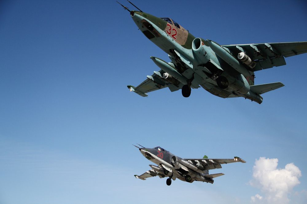 Ролик снят с земли местным жителем. За 20 секунд в кадре пролетают четыре штурмовика Су-25 и три ударных вертолета Ми-28НМ. Все они спешат нанести удар по противнику.