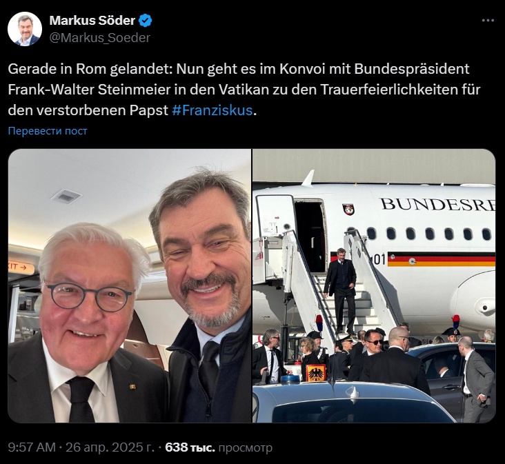 На опубликованном в соцсети X (ранее Twitter; заблокирована в РФ) снимке Штайнмайер и Зедер весело улыбаются, глядя в камеру. В подписи к фото Зедер заявил, что только что приземлился в Риме и в сопровождении президента ФРГ направляется на похороны Папы Римского.