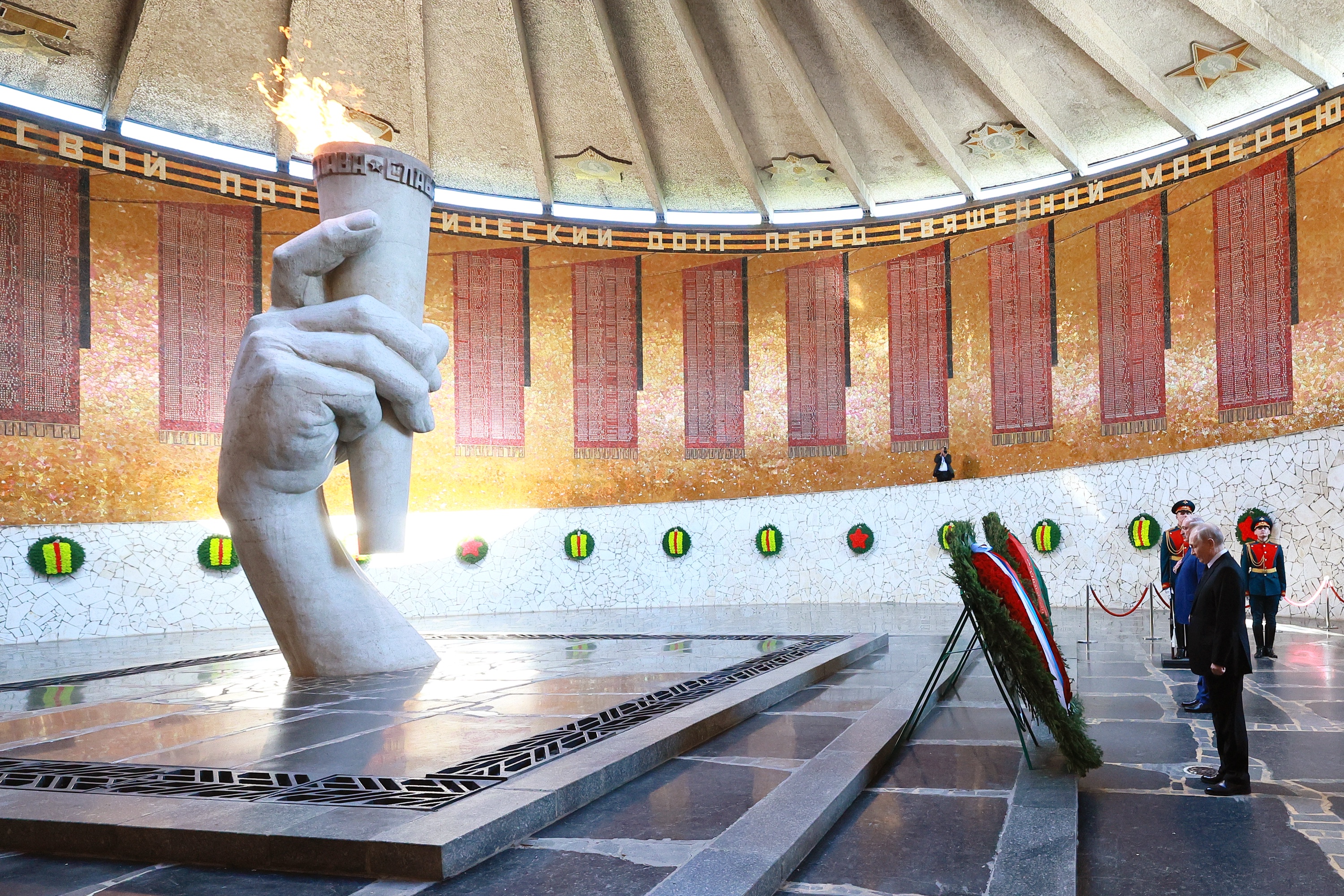 "Еще раз хочу Вас поблагодарить за то, что Вы сегодня здесь, в Волгограде, на священной для всех нас Сталинградской земле вместе с нами отмечаете эту славную Победу", - сказал президент РФ. "И очень рассчитываем видеть Вас в Москве, в день основных торжеств - 9 мая. Знаю, что Вы приняли решение о том, чтобы ваш парадный расчет тоже прошел по Красной площади. Спасибо Вам большое", - добавил он.