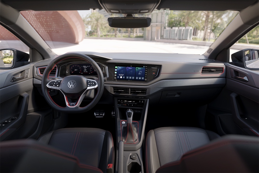 В салоне Nivus GTS повторяет соплатформенный Polo GTS: сиденья со спортивным профилем и новой обивкой, красные акценты, алюминиевые накладки на педали, другая графика приборной панели.