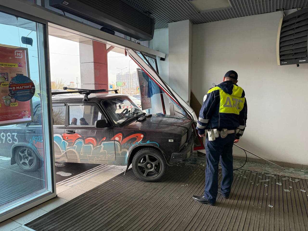 Люди не пострадали, только сама легковушка и фасад магазина.