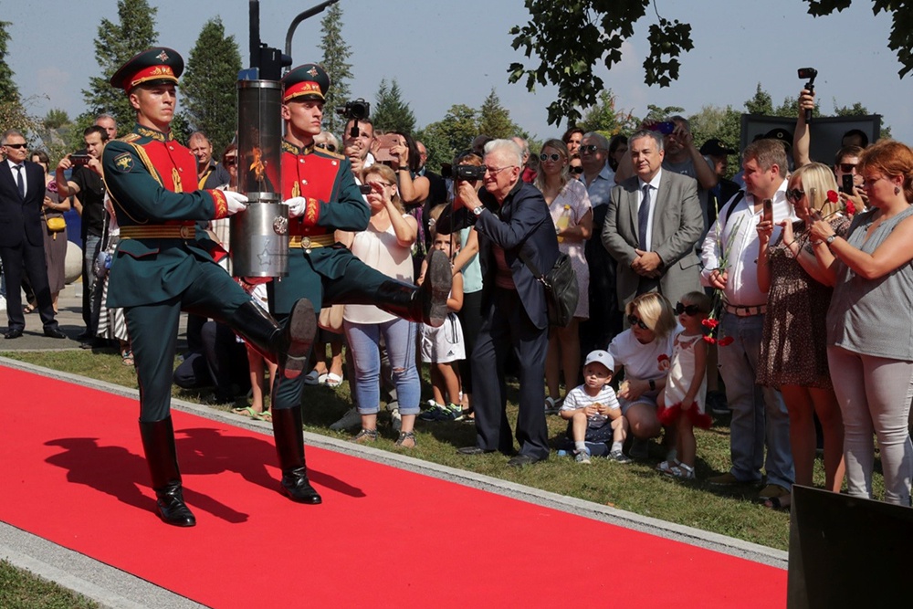 Транспортировка и зажжение Вечного огня проводились при участии российского почетного караула.