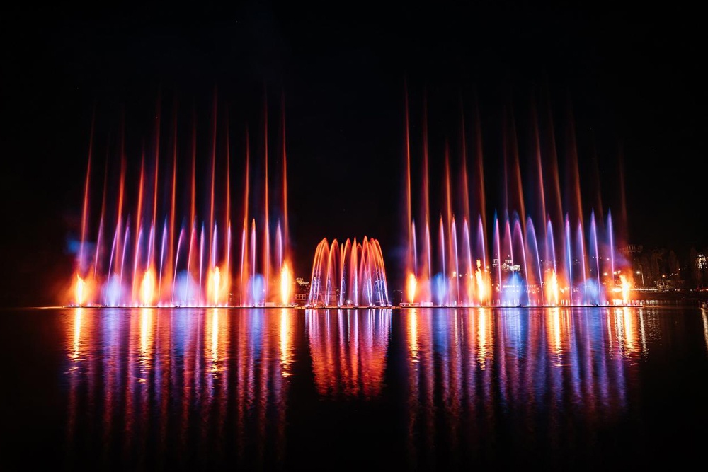 Расположенный в акватории озера Абрау под Новороссийском фонтан представляет собой фееричное сочетание танцующих водных струй, лазерного шоу и огненных вспышек, синхронизированных с музыкой, залпы воды достигают высоты до 70 метров. Программа "Игристое путешествие" предлагает зрителям виртуально совершить кругосветное турне всего за 25 минут.
