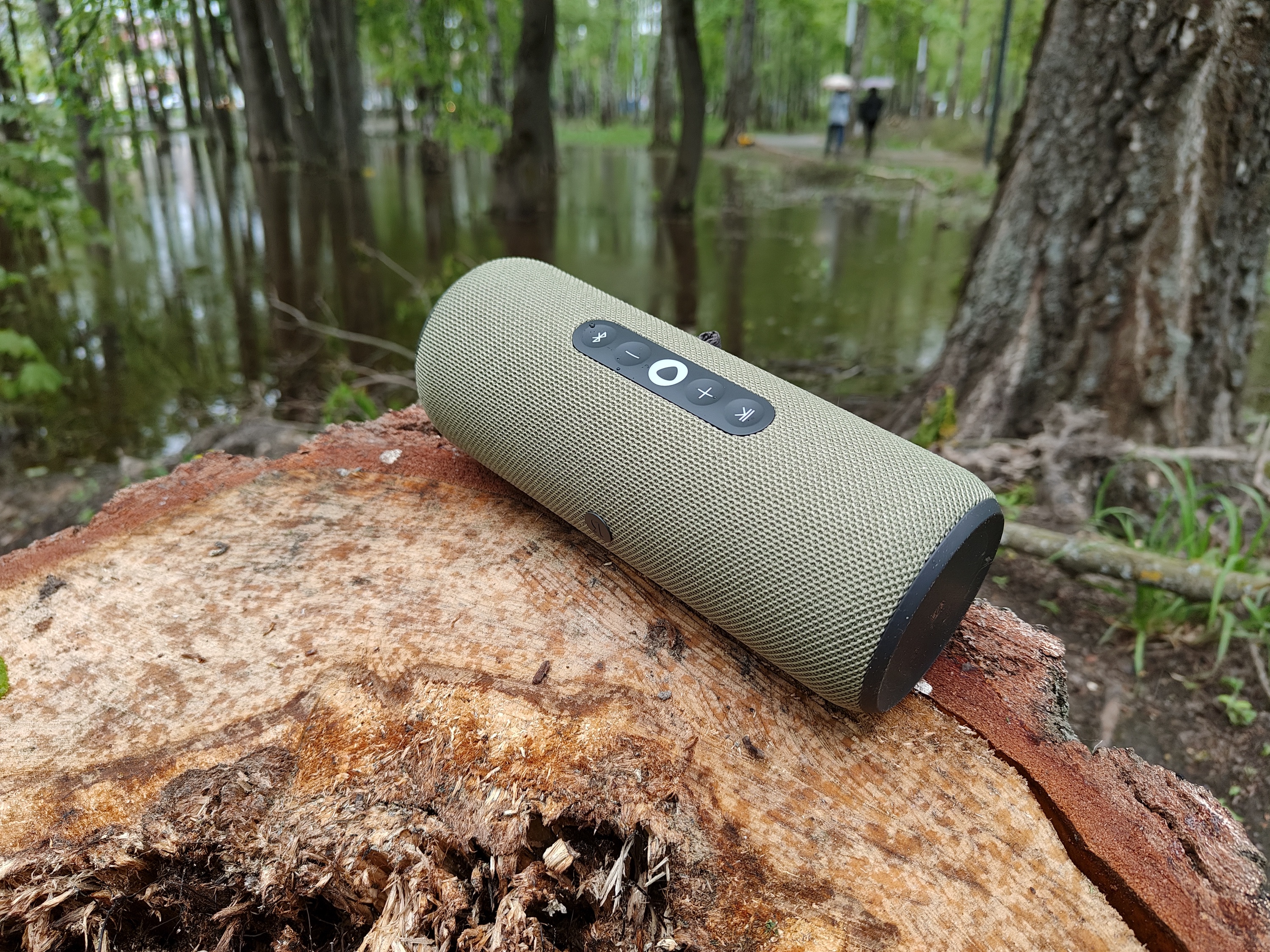 У нас на тесте представлена колонка в зеленом защитном цвете. Есть еще черный вариант. Обе раскраски производитель называет "приглушенными". Большая часть поверхности затянута приятной на ощупь тканью, которая из-за своей структуры не склонна к собиранию следов от пальцев.