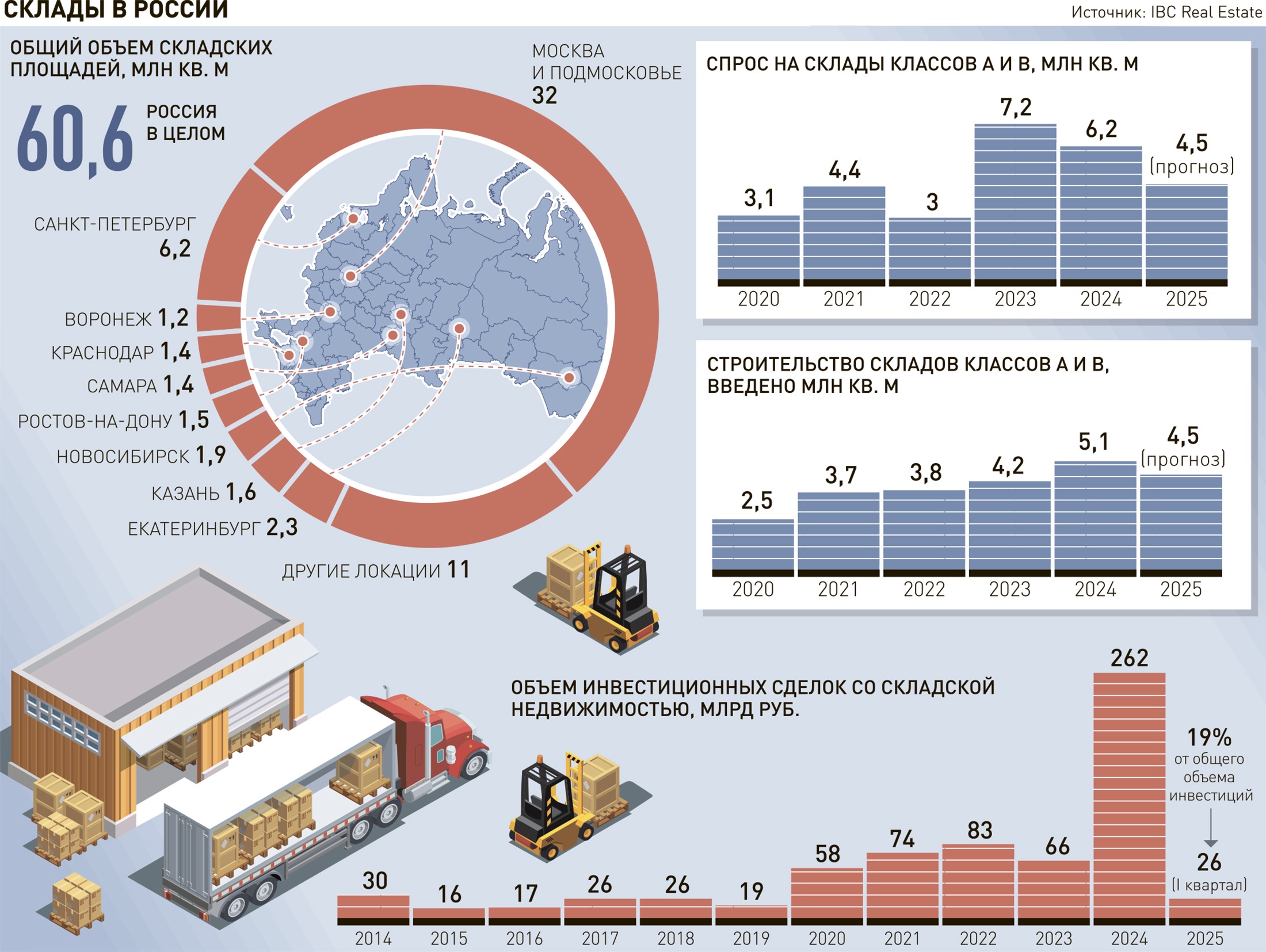 С 2020 года, когда начала бурно расти онлайн-торговля, интерес к складским площадям резко вырос. Так, по данным CMWP, спрос на складскую недвижимость в 2014-2019 годах колебался в пределах 1,7-2,4 млн кв. м в год, а в 2024 году достиг 7,6 млн кв. м, причем 63% спроса пришлось на долю электронной коммерции.