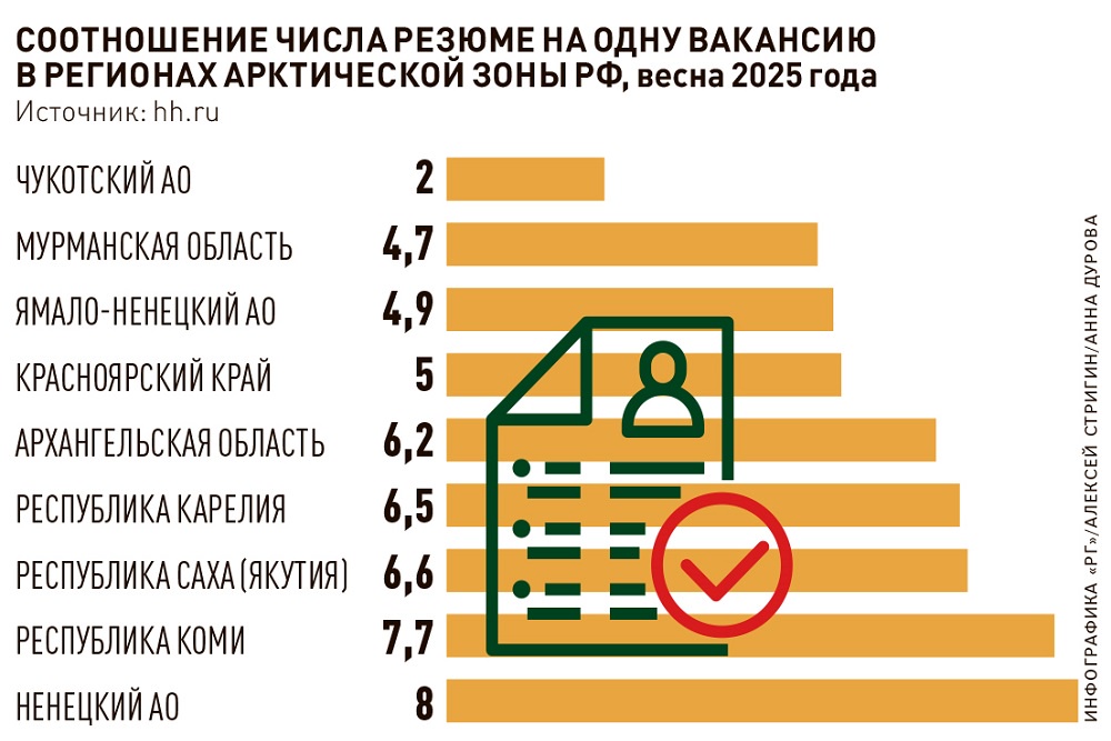 Согласно данным исследования, опубликованного hh.ru, Коми, Карелия и Архангельская область вошли в рейтинг северных регионов с наилучшим кадровым климатом. Аналитики компании показывают, что наиболее гармоничное соотношение резюме и вакансий в Арктической зоне РФ (АЗРФ) сейчас зафиксировано в Красноярском крае, Республиках Карелия и Коми, Архангельской области, в Якутии и ЯНАО. В этих регионах на одну вакансию приходится от 5 до 8 активных резюме от соискателей, что соответствует норме для рынка труда. Чуть меньше соискателей среди местных жителей в Мурманской области - 4,7 активного резюме.