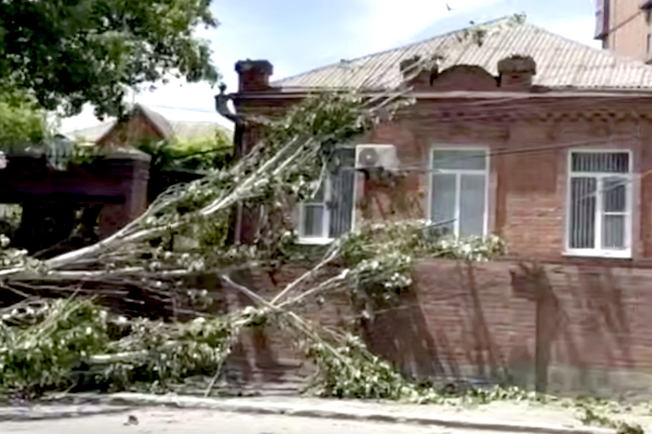 В Ростове-на-Дону второй день не утихает порывистый, шквальный ветер. Местные жители выложили в социальных сетях фото, на котором рухнувшее дерево, похожее на тополь, задело конек одноэтажного кирпичного жилого дома.