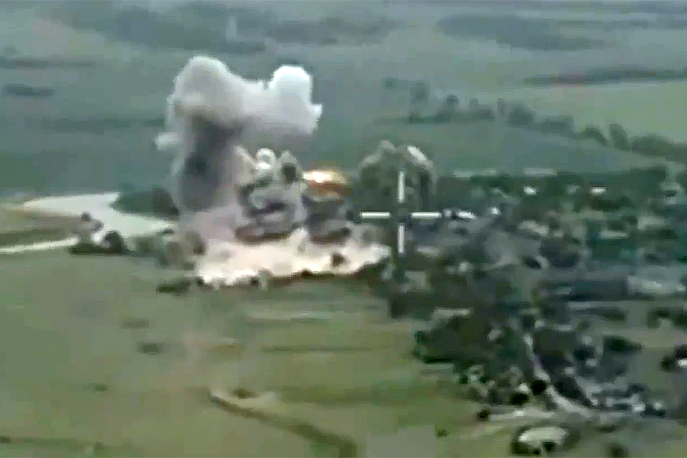 На кадрах видно, как на окраине населенного пункта один за другим раздаются мощные взрывы и поднимаются в воздух столбы дыма.