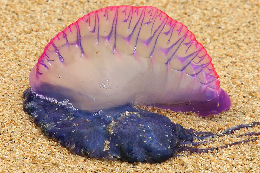 Португальский кораблик - это вид колониальных гидроидных отряда сифонофор, его колония состоит из полипоидных и медузоидных особей. На верхушке у физалии крупный прозрачный пузырь - его длина может составлять 30 сантиметров. Внутри - газ, удерживающий "шляпку" на поверхности воды. Визуально за счет этого пузыря он и похож на кораблик, но ввиду опасности, которую он представляет, его прозвали военным.