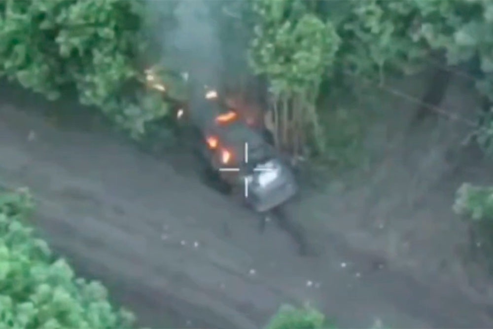 Из загоревшегося после поражения дроном КВН пикапа ВСУ никто не смог спастись