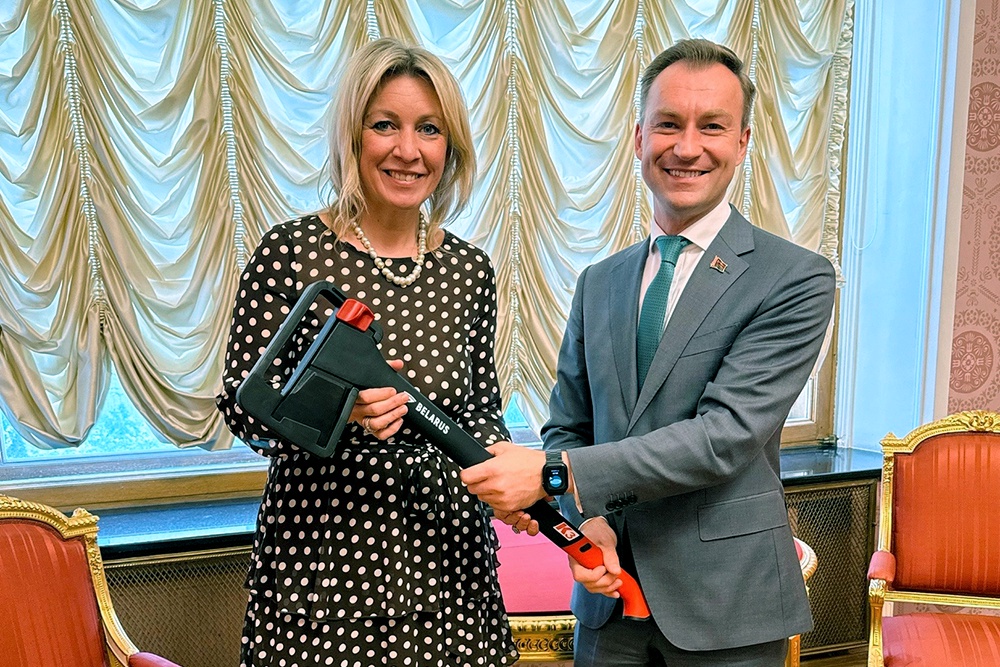 Захарова и Варанков, как видно на фотографии, стоят рядом и обеими руками держатся за топор производства Минского транспортного завода.