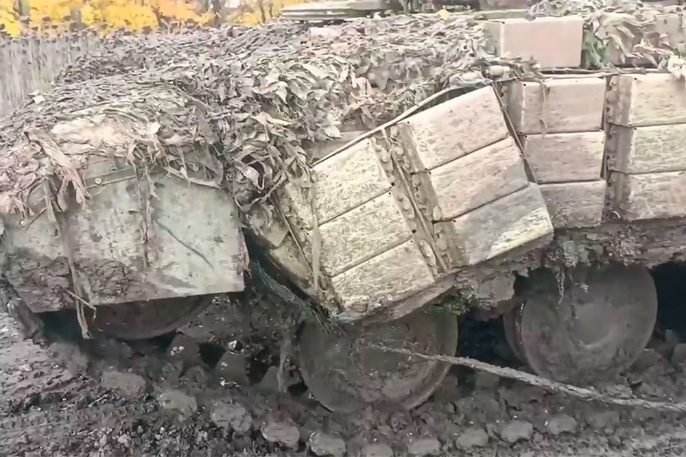Как раз в нем и запутался Т-64БВ формирований киевского режима. В социальных сетях появилось видео, где показана ставшая намертво боевая машина противника. Дело усугубилось еще тем, что почва размокла и превратилось в нечто очень вязкое, прилипающее к каткам и тракам.