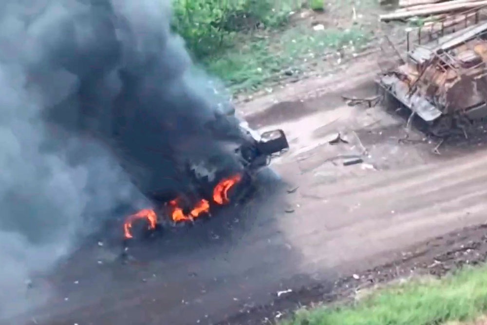 Позже здесь оказался еще поставленный властями Финляндии бронетранспортер. Как можно заметить, у него на крыше установлены средства радиоэлектронного противодействия, которые, как давно уже выяснено, совершенно не мешают работе БПЛА, управляемых по оптоволоконному кабелю. Один удар - и "сто восьмидесятый" загорелся.