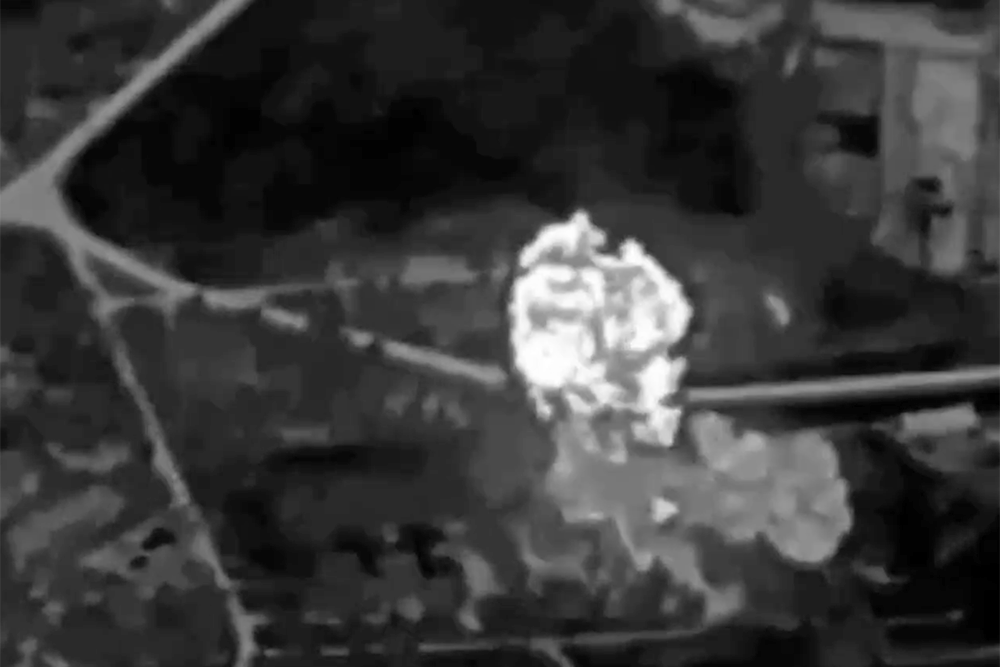 На кадрах, снятых с беспилотника, видно, как ракета стремится к цели. Затем следует мощный взрыв.