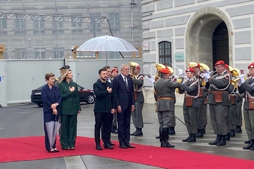 На кадрах Зеленский выходит из BMW и идет по красной ковровой дорожке к Ван дер Беллену, а его супруга Елена после рукопожатий остается в стороне вместе с женой австрийского президента. На улице идет дождь, а Зеленский Ван дер Беллен стоят под зонтом. Их жены мокнут.