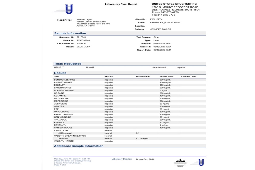 Маск в том числе проверялся на употребление кокаина, кетамина, барбитуратов, каннабиноидов и других наркотических веществ.