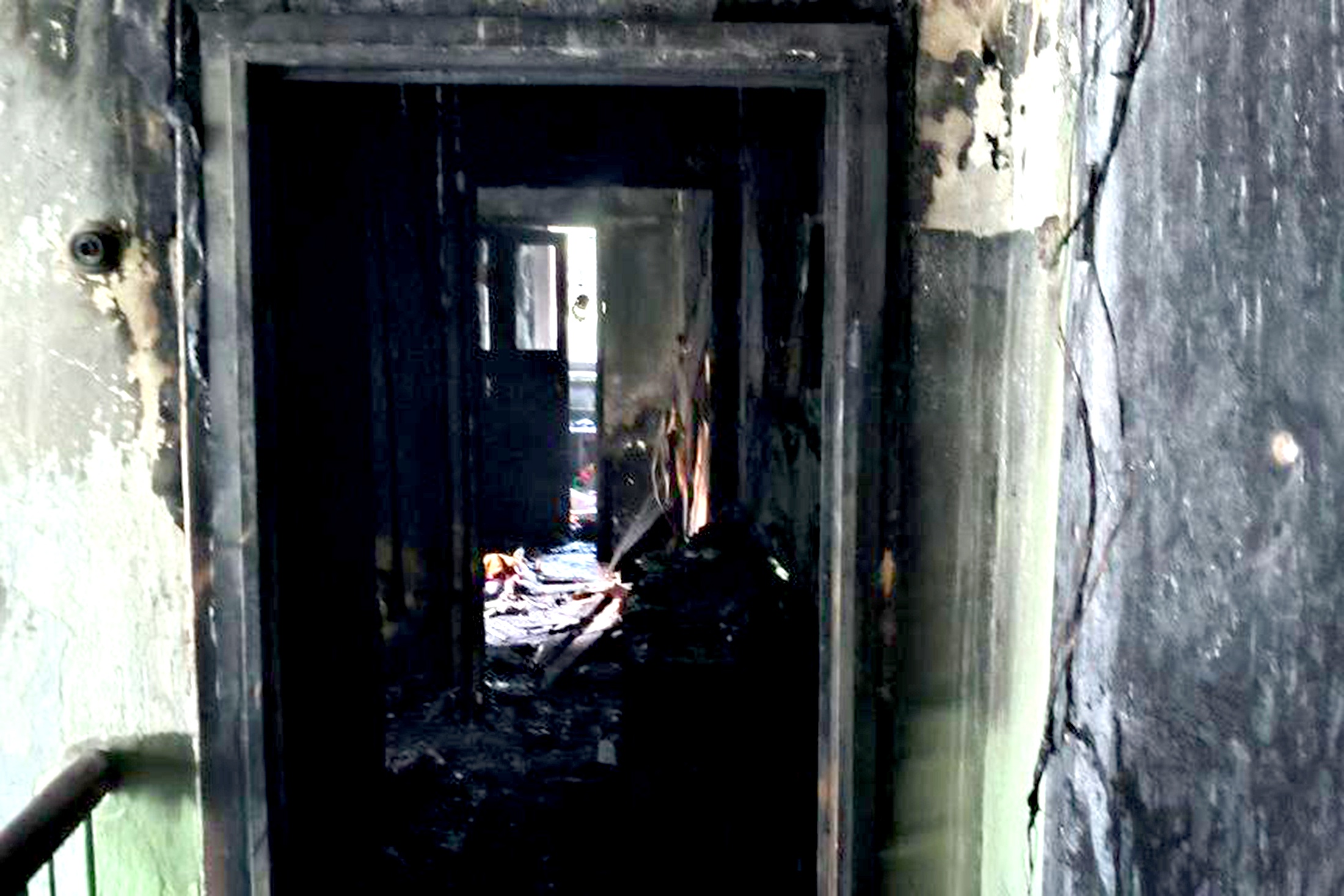 На опубликованных снимках показан вход в сгоревшую квартиру, на них можно увидеть длинный коридор с обугленными стенами.