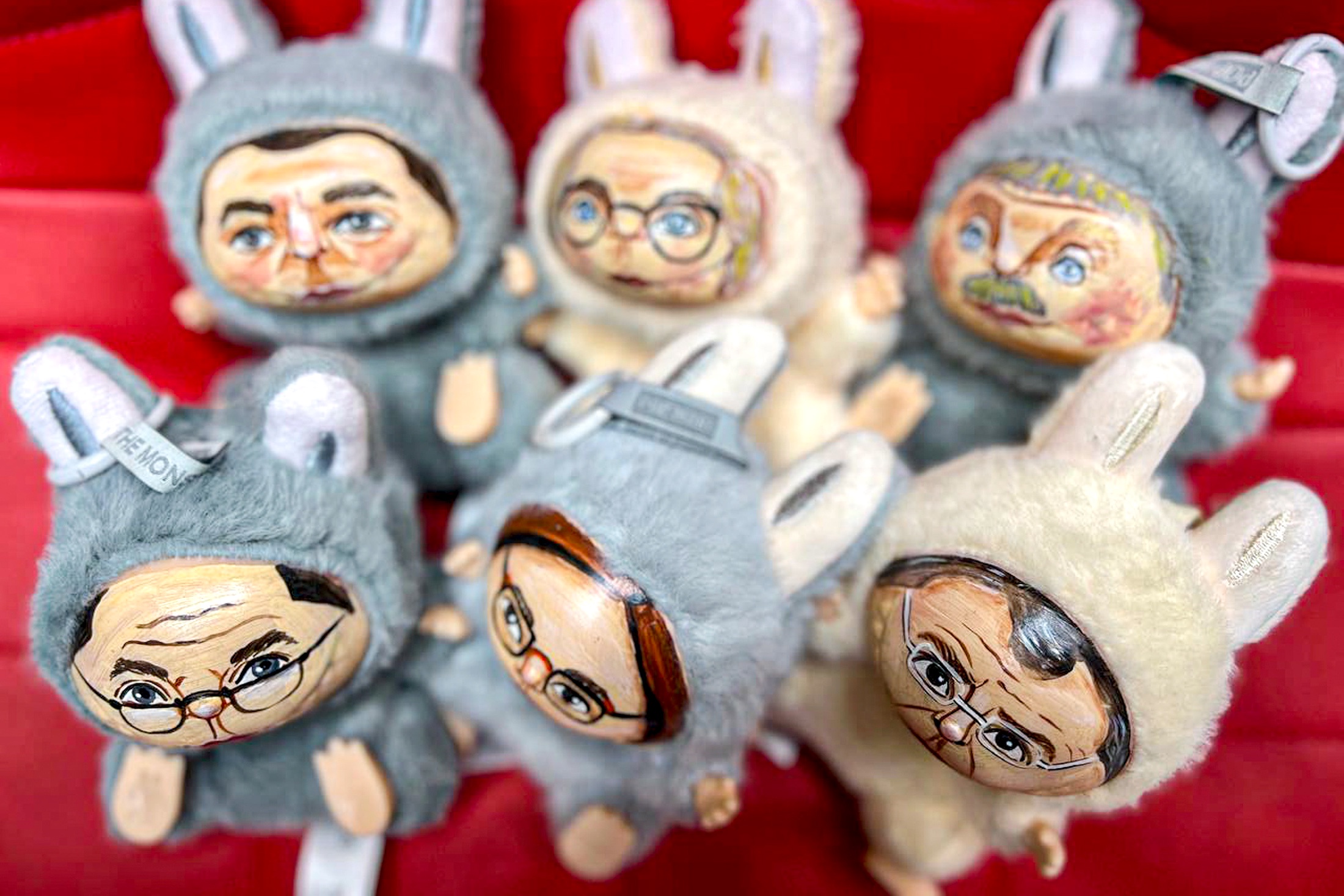 Пушистые игрушки представлены в двух цветах. На них изображены лица официального представителя Кремля Дмитрия Пескова, министра иностранных дел РФ Сергея Лаврова, главы Центробанка Эльвиры Набиуллиной и др.