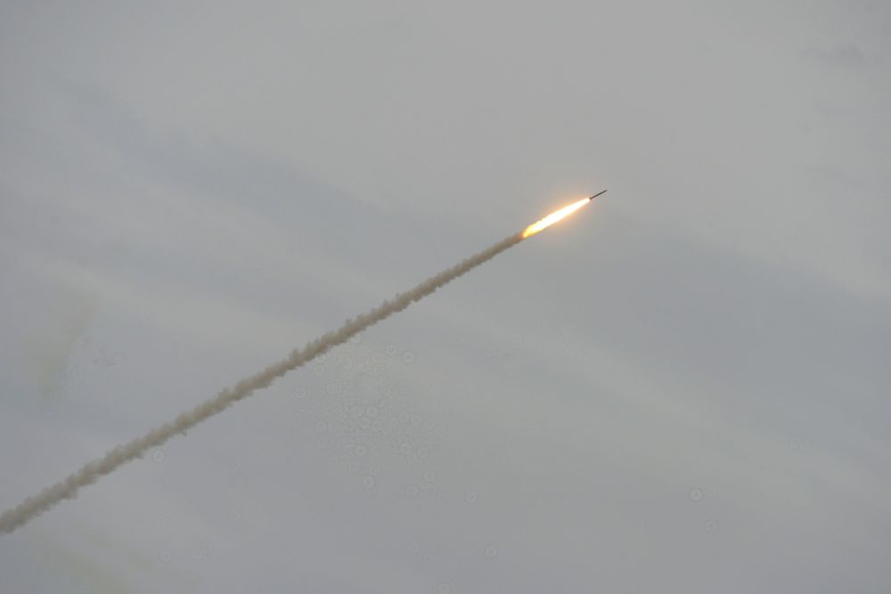 На рассвете снаряд ВС РФ с характерным свистом реактивного двигателя пролетает через кадр слева направо, отстреливая тепловые ловушки.