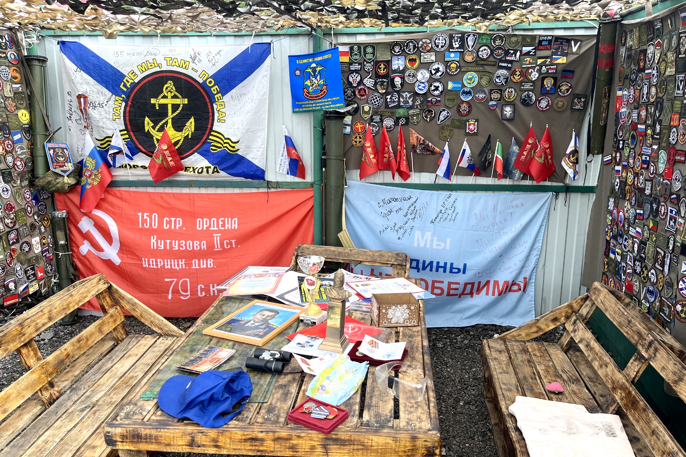 Вот беседка, куда бойцы заходят без стука, как домой: передохнуть, перекурить, оставить на память шеврон. Стены усеяны нашивками на липучках: "Отвага. Честь. Долг", "Курская битва 2.0", "Не зли русских". Их оставили парни из Владивостока, ЛНР, Башкирии, от Калининграда до Владивостока, и каждый - чья-то судьба, чье-то "спасибо" мальчишке, который все эти месяцы ждал их на этой дороге.