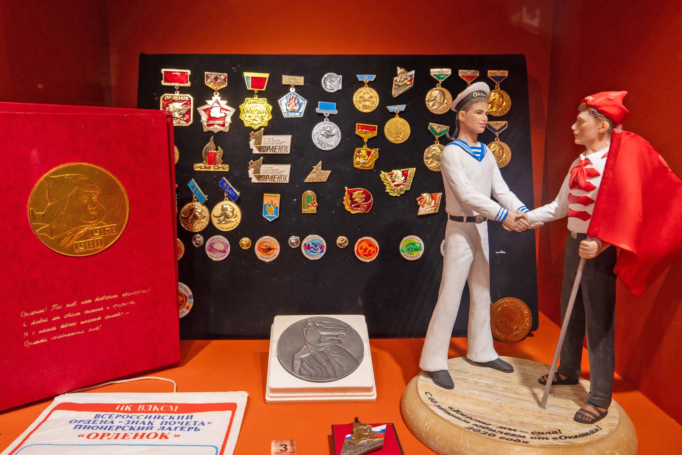 В экспозиции представлено около 100 подлинных раритетов. Их предоставил музей истории Всероссийского детского центра "Орлёнок" и Московский дворец пионеров на Воробьевых горах. "На протяжении всех лет своей деятельности "Орленок" учит ребят быть справедливыми, ценить настоящую орлятскую дружбу, быть активными участниками социальной жизни страны, не на словах, а на деле заботиться о процветании своей страны", - рассказала на открытии директор Детского центра Музея Победы Елена Слесаренко.