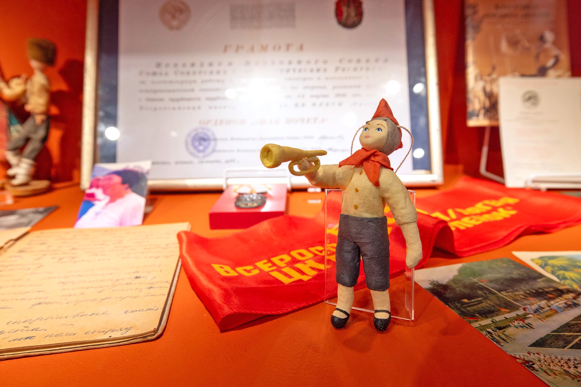 Но большая часть экспонатов - это фотографии, печатные издания, фигурки пионеров, записи и дневники вожатых, рабочие тетради дежурных по лагерю и другие документы.