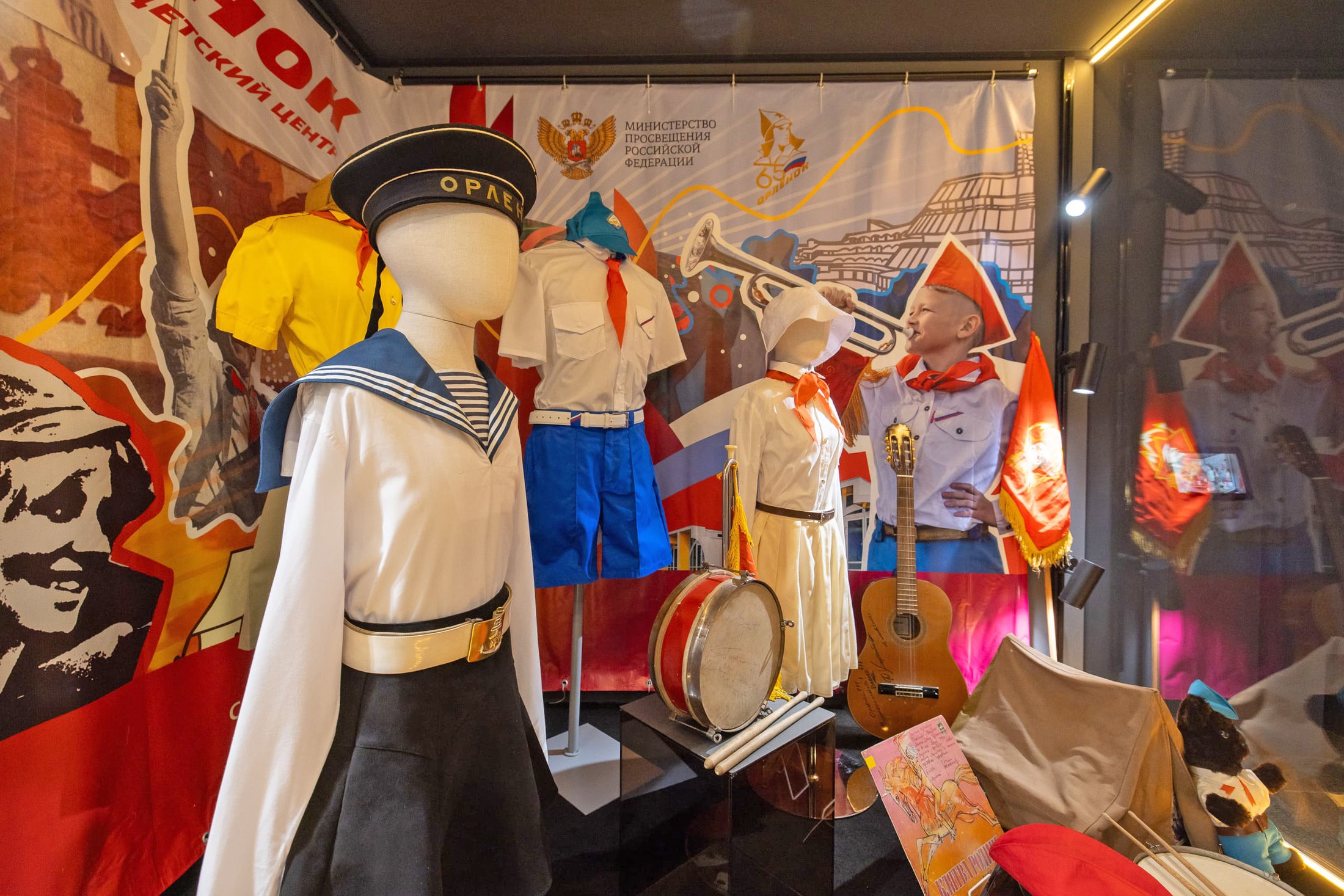 Увидеть в экспозиции можно и символы пионерии - алый галстук, горн и барабан. Как отмечают специалисты музея, есть и уникальные экспонаты, например, первое красное бархатное знамя "Орлёнка" и галстук, который в 2022 году побывал на МКС. А также гитара барда, поэта, киноактёра Юрия Визбора.