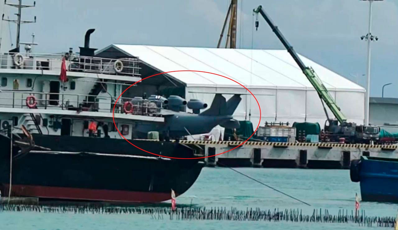 На снимке, опубликованном в китайских социальных сетях, уникальный самолет, окрашенный в серый цвет, виден на заднем плане.