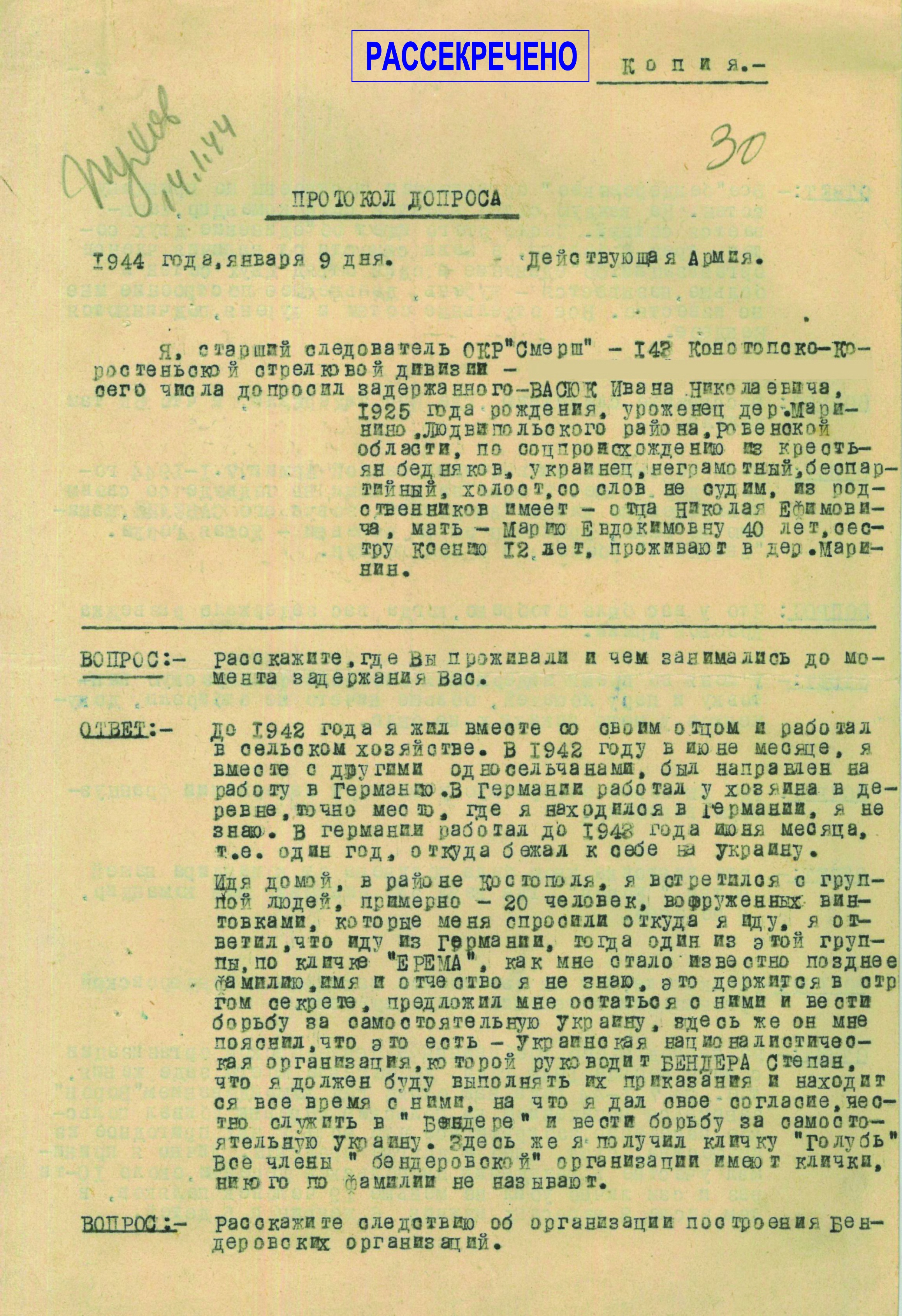 Центр общественных связей ФСБ публикует рассекреченный протокол допроса непосредственного участника Волынской резни члена ОУН-УПА Ивана Васюка с псевдонимом "Голубь" (ОУН - Организация украинских националистов и УПА - Украинская повстанческая армия признаны экстремистскими организациями и запрещены в РФ).