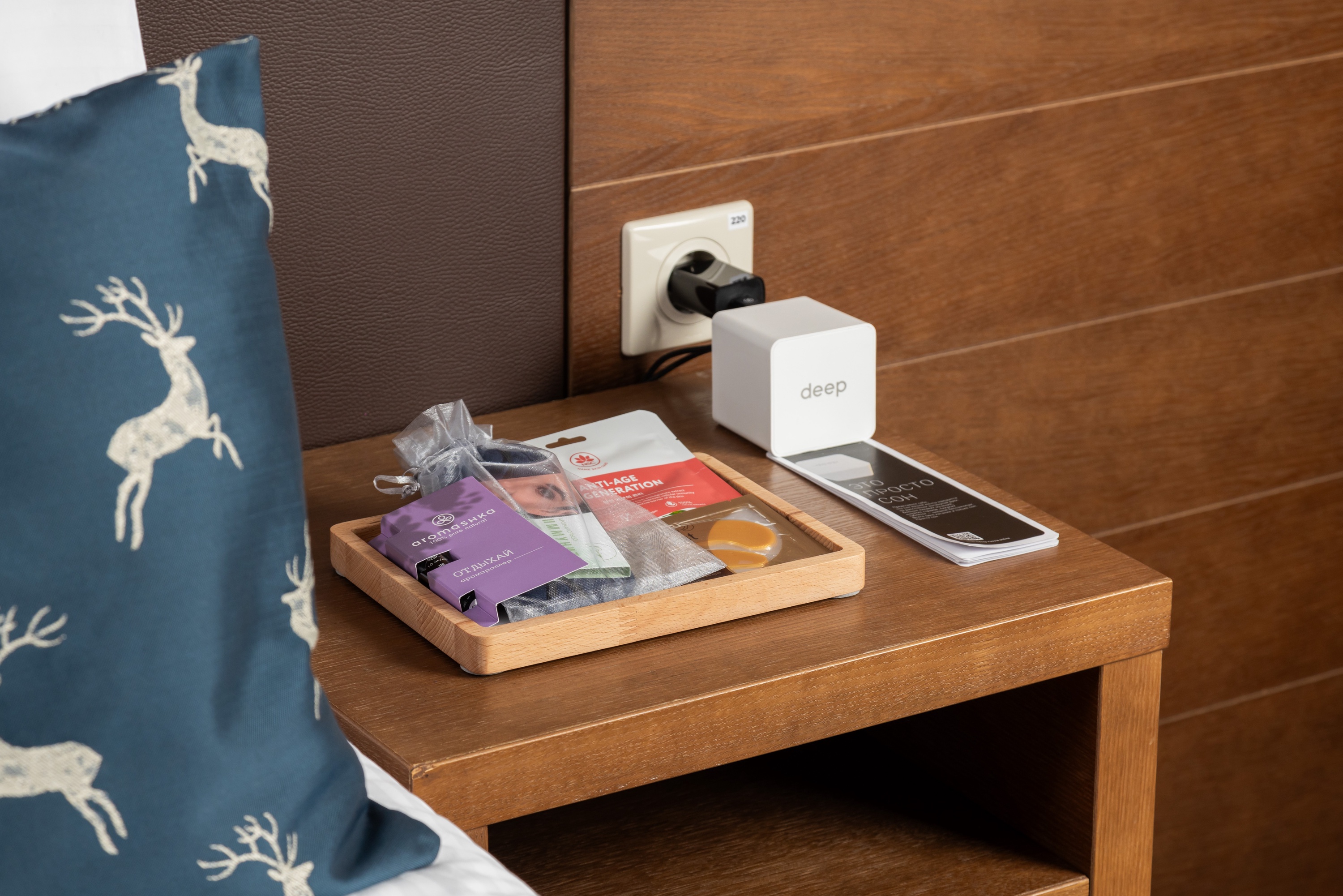В таких номерах очень тихо: специальная выдвижная заслонка активируется при закрытии двери, что обеспечивает полную шумоизоляцию. При нормативах тишины в номерах пятизвездочных отелей в 25 децибел там 23-24. Там есть специальные шторы блэкаут, которые не пропускают солнечный свет и крепление которых не допускает зазоров и посторонней засветки сверху, сбоку или снизу окна, а для дополнительного комфорта есть массажер для глаз с подогревом и встроенной музыкой - шумом моря и пением птиц, маски для сна и восковые беруши.