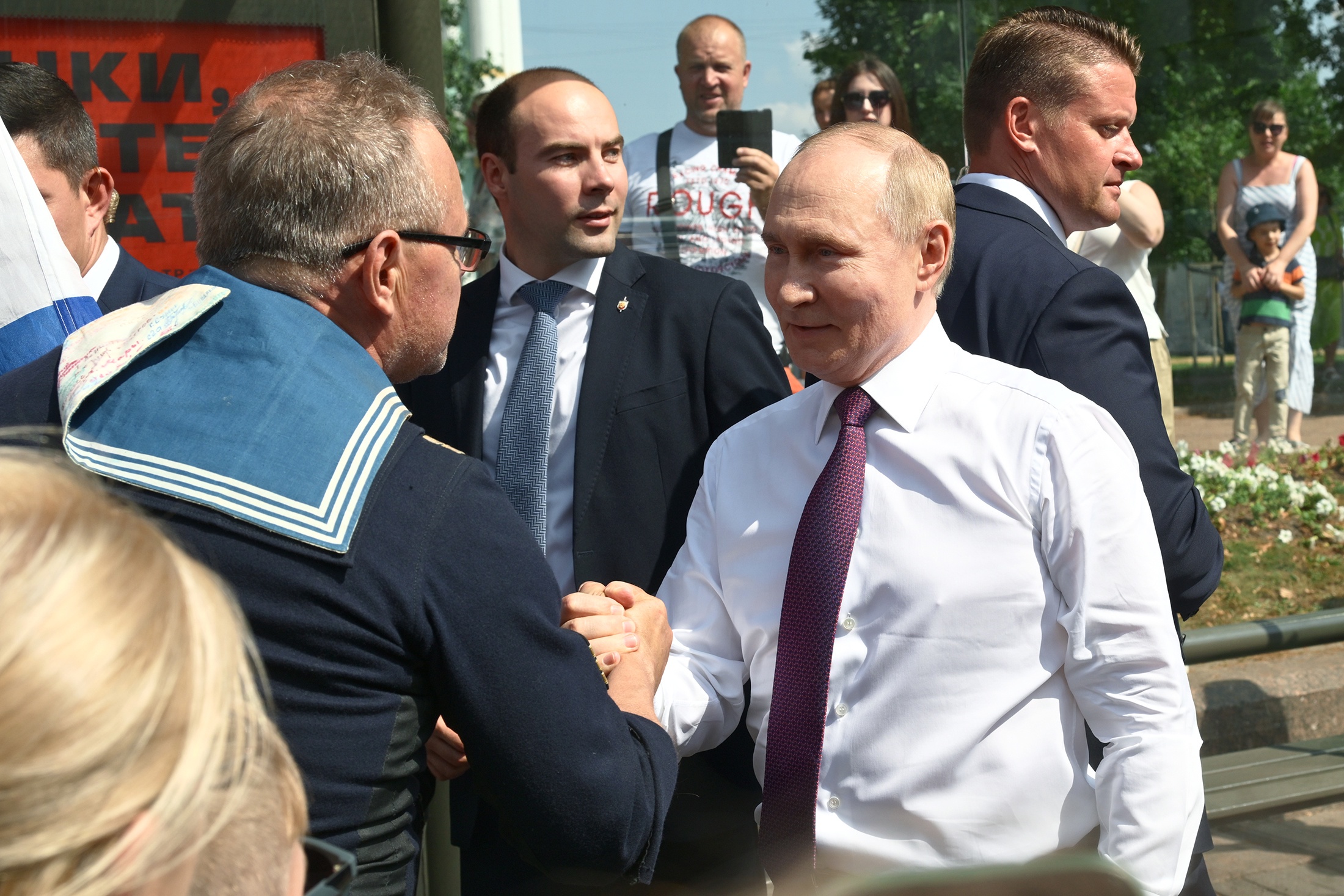"Хочу еще раз поблагодарить вас за сегодняшнюю работу. Моряки пришли и в День Военно-Морского флота провели такую значимую боевую работу для фактически колыбели российского флота, прямо из Кронштадта работали", - сказал Путин во время чаепития с моряками.