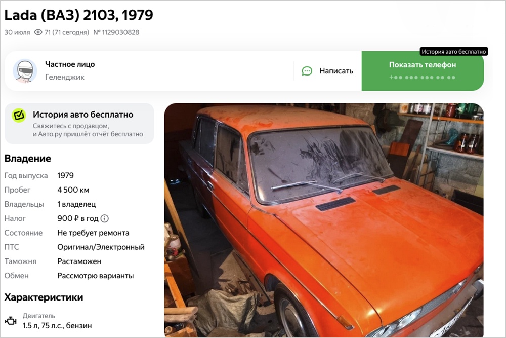 В РФ продают ВАЗ-2103 в музейном состоянии с пробегом 4500 км