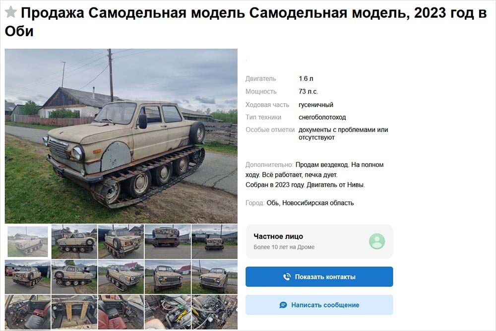 Техника собрана в 2023 году и, по словам продавца, полностью на ходу: работает двигатель, трансмиссия и отопитель. Посадочная формула - 1+1. Документов на машину нет, но автор проекта подчеркивает, что вездеход отлично подходит для передвижения по труднодоступной местности, в том числе по болотам и лесам.