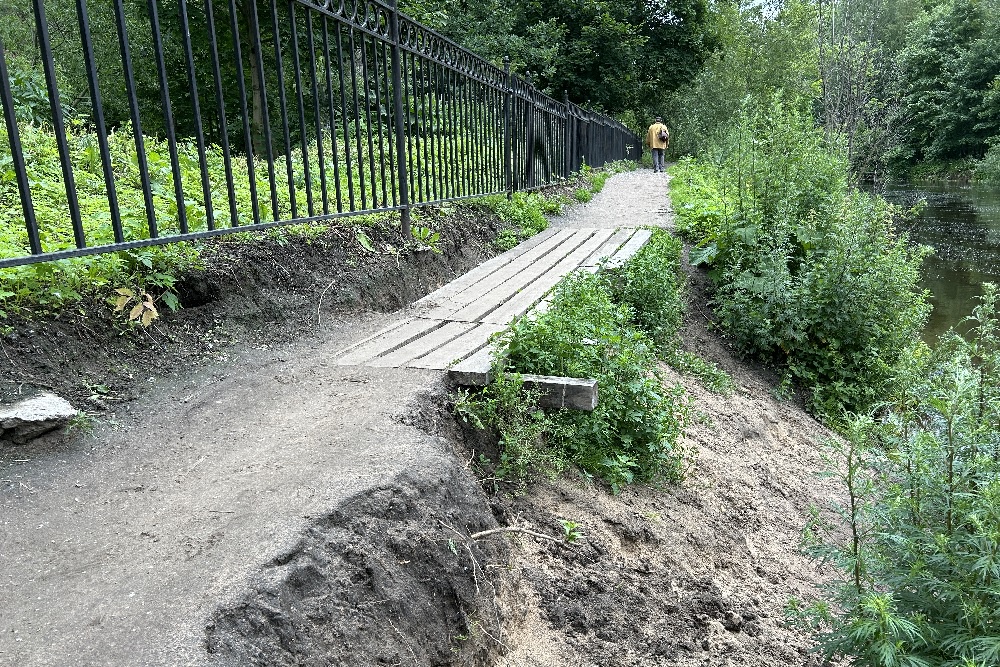 Идиллия заканчивается ровно у ограды кладбища "Остров Декабристов". Тропинка вдоль него сразу становится грунтовой, а еще через сто метров, там, где Смоленка делает поворот, как раз наблюдается сползание грунта в реку. Прохожие, с которыми побеседовал корреспондент "РГ", разошлись с автором письма в газету в оценке того, когда именно это произошло. По их словам, истории не один год, а уже как минимум три. Но согласились с тем, что за прошедшее время ничего, кроме досочного настила, сделано не было.
