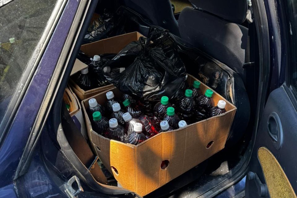 На фотографиях, которые также опубликовала пресс-служба полиции Краснодарского края, видно, что в машине находятся мятые картонные коробки с пластиковыми бутылками, наполненными жидкостью разного цвета.
